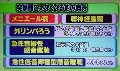 | 他の病気 | 突発難聴になっても症状によっては、診断名は突発性難聴ではなく、次のようになる。![]() 初診時に音に対して全く反応がなく、めまいや吐き気が繰り返し起こる場合は、突発性難聴ではなくメニエール病と診断する。 |